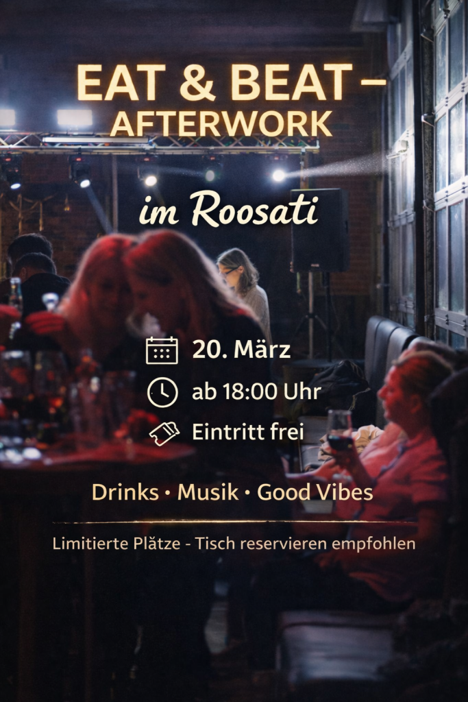 Am Freitag, dem 20.03. Laden wir euch wieder ab 18 Uhr zu unserem Eat & Beat Afterwork-Abend ins Roosati in Mettmann ein. Demnächst jeden zweiten Freitag im Monat mit Cocktails und guter Musik ins Wochenende starten. Freut Euch auf eine besondere Kombination aus gutem Essen, erfrischenden Drinks und DJ-Sounds. Genießt den Abend in stilvoller Atmosphäre, trefft Freunde, lernt neue Leute kennen und Lasst den Tag bei guter Musik und bester Stimmung ausklinken.